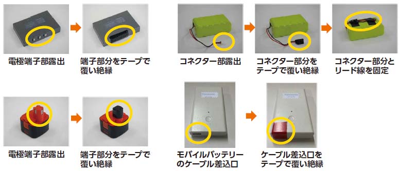 写真出典:一般社団法人JBRC(2025年10月)「小型充電式電池のリサイクル回収依頼時の安全処理方法(事例)」
